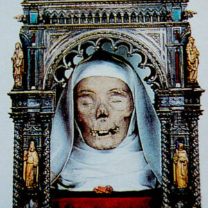 When Catherine died the folks in Siena wanted to keep her body but Rome was all ixnay on that idea. They wanted it. So the Sienese settled for just a bit. They cut off her head and stuffed it in a bag. But, sad to say, they were caught by some Roman guards so what could they do but pray to Catherine to save their butts somehow. And lo, when the bag was opened it was full of rose petals! How sweet. Here’s Catherine’s head looking not so babalicious: