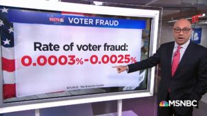 The Heritage Foundation, that prominent conservative “think” tank, in a dazzlingly ineffective attempt to convince America that voter fraud is rampant, has a database of actual cases. They list a whopping 13 instances of voter impersonation this century, and two of those are really the same case so they actually only have 12. One of the 12 was a prank, one was done deliberately to prove it was possible, which it failed to do. That leaves us with 10 actual cases of intentional voter impersonation in 20 years, and we’re talking a lot of elections, not just nationals. Some of these impersonations were in county commissioner and even school board elections. In fact, there have been over a billion ballots cast in this country during that time period, so if you divide 10 by a billion you basically get 0. That’s so rare it’s bleeding.
